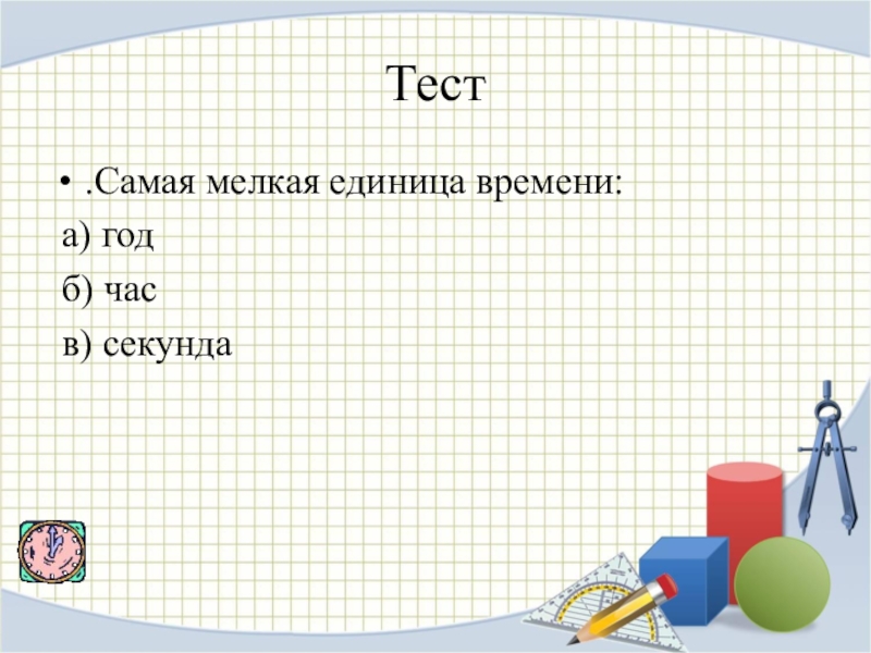 Тест.Самая мелкая единица времени: а) год б) час в) секунда