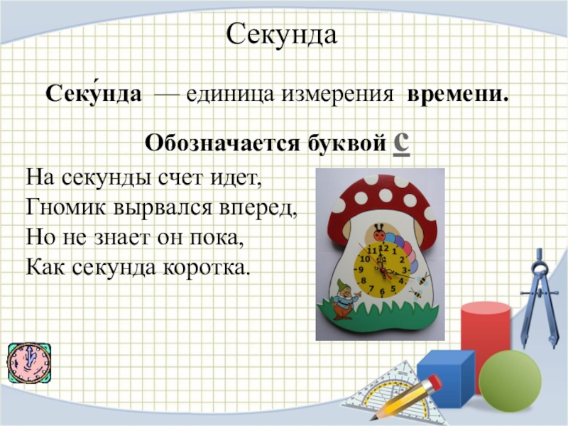 СекундаСеку́нда  — единица измерения времени.Обозначается буквой с На секунды счет идет, Гномик вырвался вперед, Но не знает он пока, Как