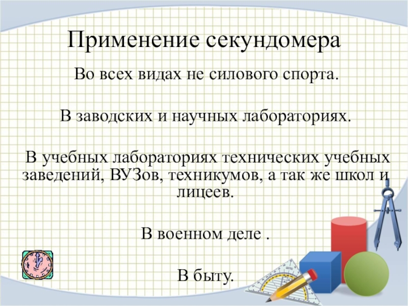 Применение секундомера Во всех видах не силового спорта. В заводских и научных лабораториях. В учебных лабораториях технических