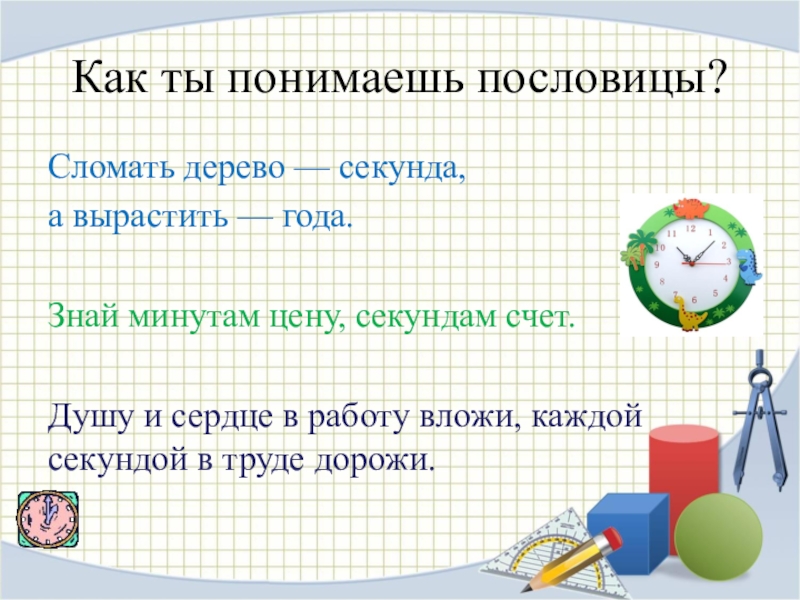 Как ты понимаешь пословицы?Сломать дерево — секунда, а вырастить — года.Знай минутам цену, секундам счет. Душу и