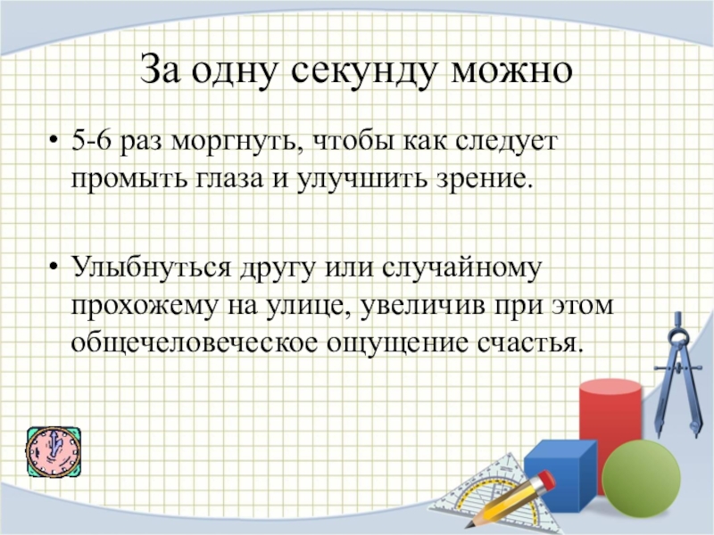 За одну секунду можно5-6 раз моргнуть, чтобы как следует промыть глаза и улучшить зрение.Улыбнуться другу или случайному