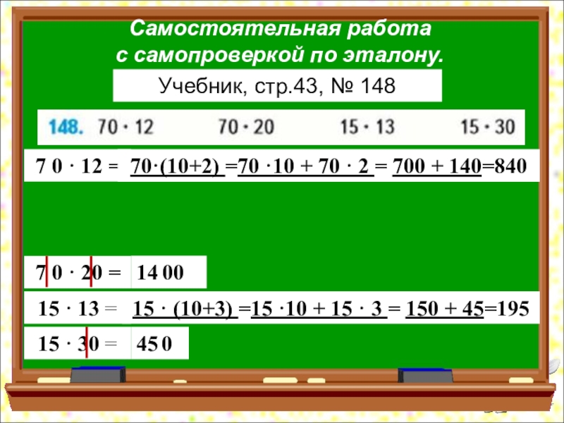 70·(10+2) =70 ·10 + 70 · 2 = 700 + 140=840