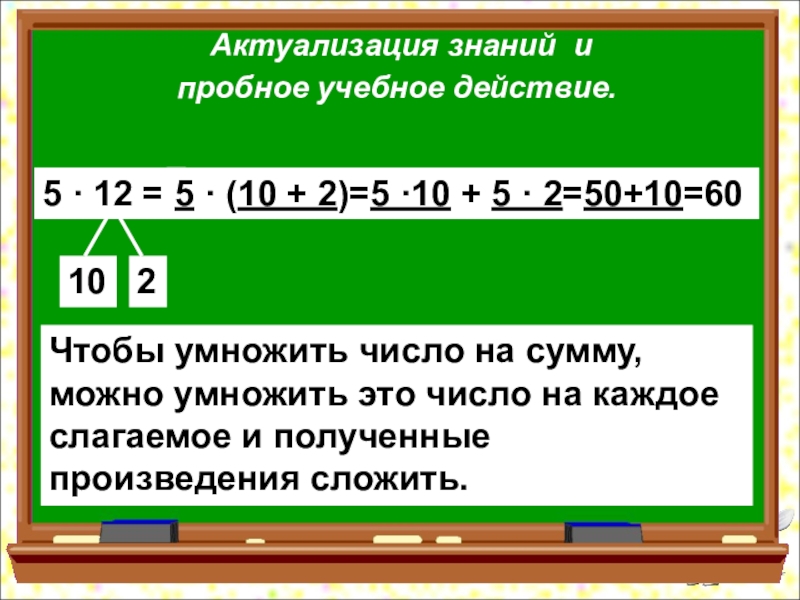Чтобы умножить число на сумму, можно умножить это число на каждое слагаемое и полученные произведения сложить.