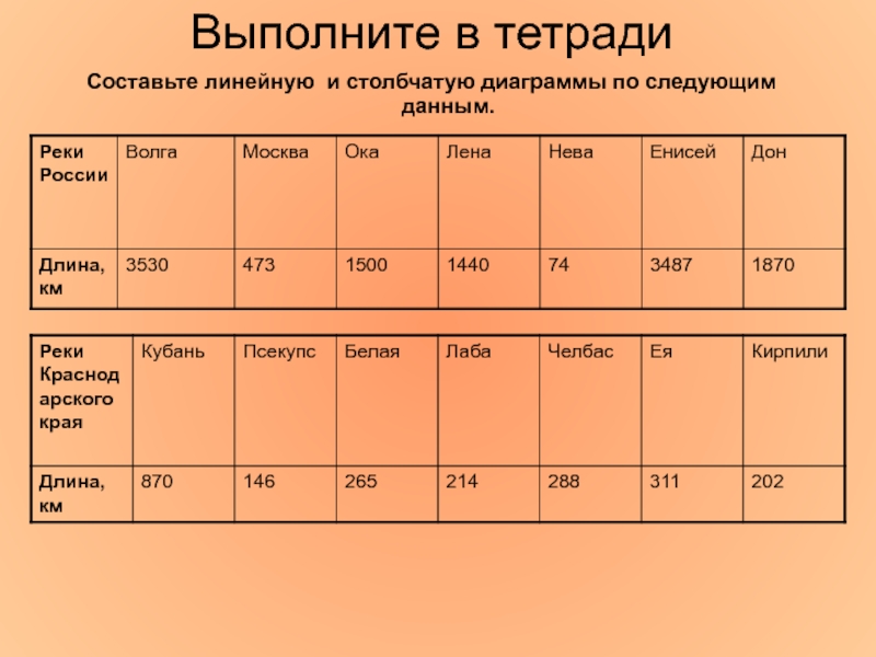 Выполните в тетрадиСоставьте линейную и столбчатую диаграммы по следующим данным.