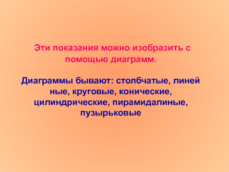 Эти показания можно изобразить с помощью диаграмм.  Диаграммы бывают: столбчатые, линей ные, круговые, конические, цилиндрические,