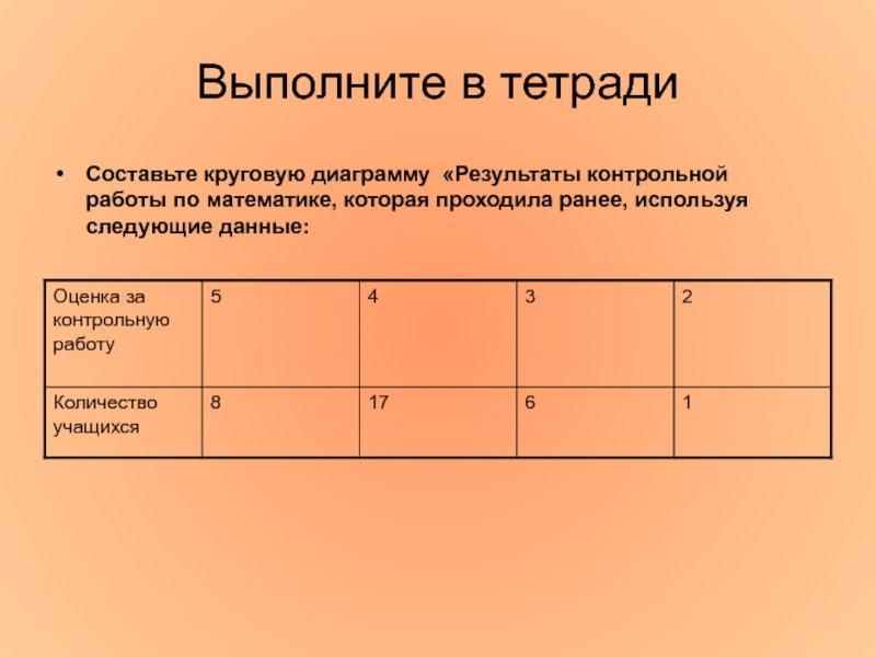 Выполните в тетрадиСоставьте круговую диаграмму «Результаты контрольной работы по математике, которая проходила ранее, используя следующие данные: