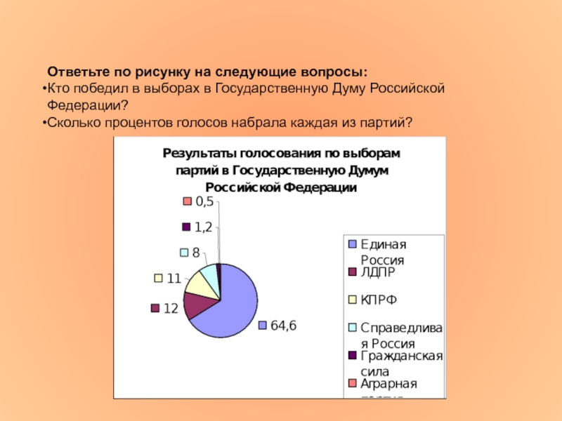 Ответьте по рисунку на следующие вопросы:Кто победил в выборах в Государственную Думу Российской Федерации?Сколько процентов голосов набрала