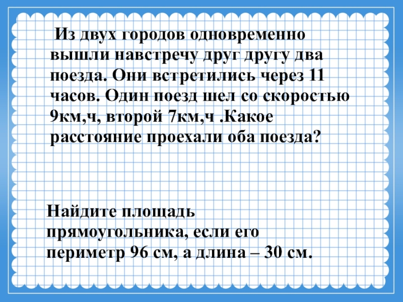 Найдите площадь прямоугольника, если его периметр 96 см, а длина – 30 см.