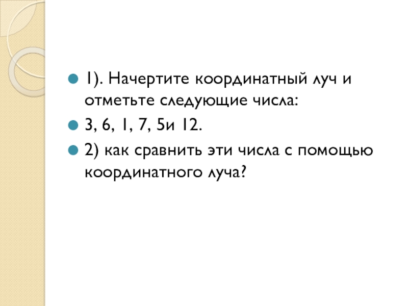 Слайд 121). Начертите координатный луч и отметьте следующие числа: