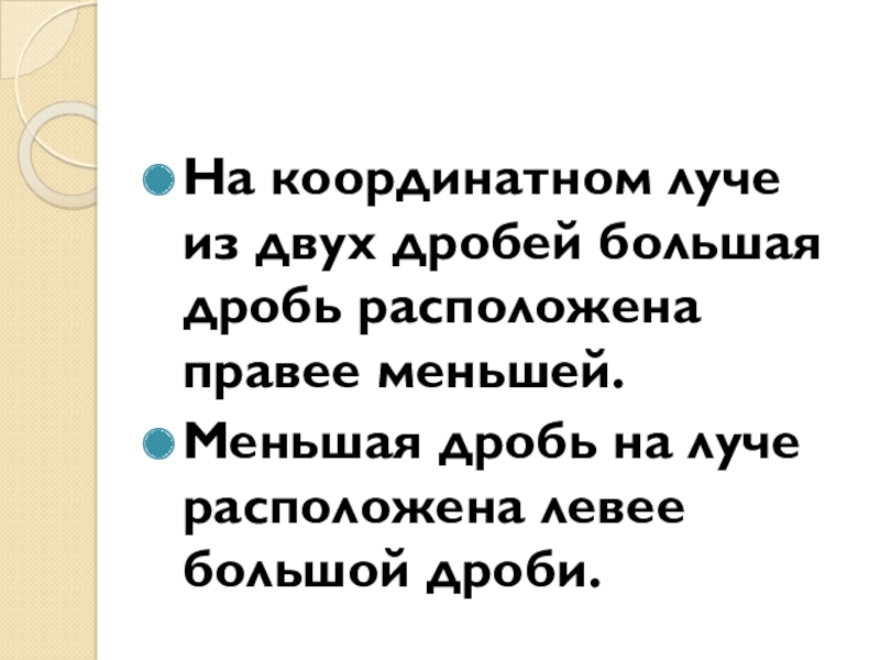 Слайд 17На координатном луче из двух дробей большая дробь расположена правее меньшей.