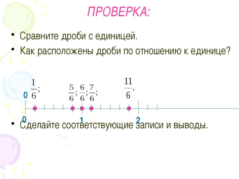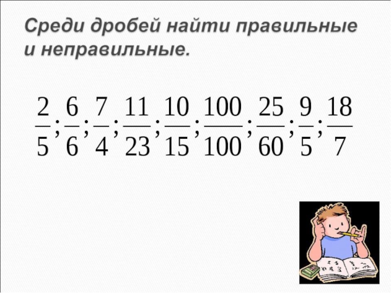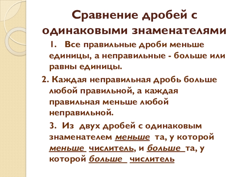 Сравнение дробей с одинаковыми знаменателями  1.  Все правильные дроби меньше единицы, а неправильные - больше