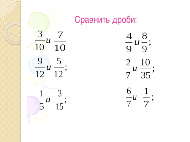 Слайд 18Сравнение дробей с одинаковыми знаменателями