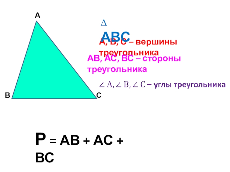 АВСА, В, С – вершины треугольника∆ АВСАВ, АС, ВС – стороны треугольникаР = АВ + АС +