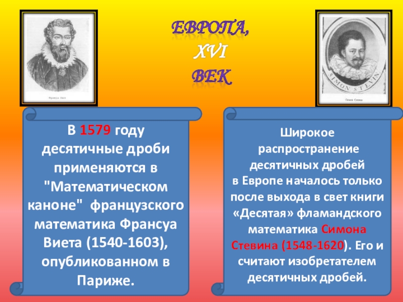 в Европе началось только после выхода в свет книги «Десятая» фламандского математика Симона Стевина (1548-1620). Его и считают изобретателем десятичных дробей.