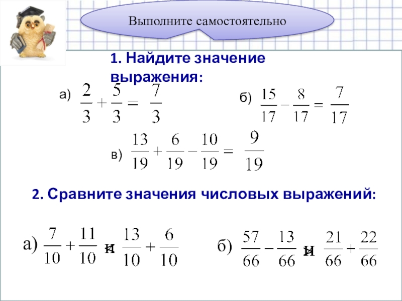 Выполните самостоятельно1. Найдите значение выражения:2. Сравните значения числовых выражений:а) а) б) б) в) ии