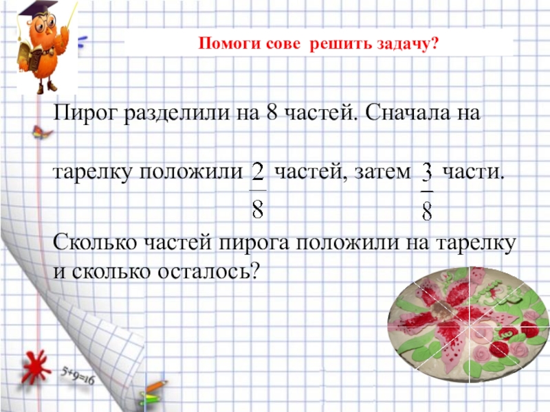 Помоги сове решить задачу?Пирог разделили на 8 частей. Сначала на тарелку положили   частей, затем