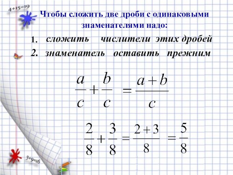 Слайд 7Чтобы сложить две дроби с одинаковыми знаменателями надо:
