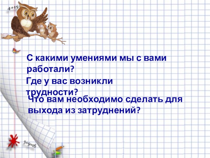 С какими умениями мы с вами работали?Где у вас возникли трудности?Что вам необходимо сделать для выхода из