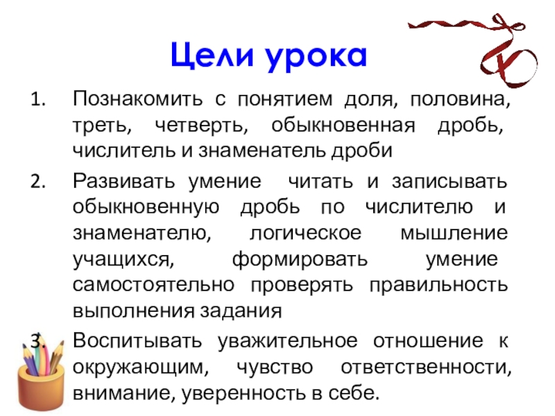 Познакомить с понятием доля, половина, треть, четверть, обыкновенная дробь, числитель