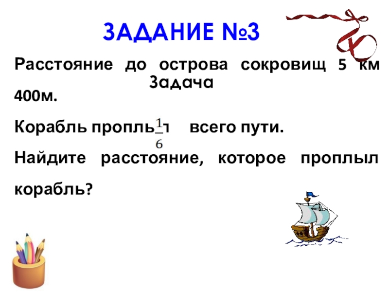 Расстояние до острова сокровищ 5 км 400м.