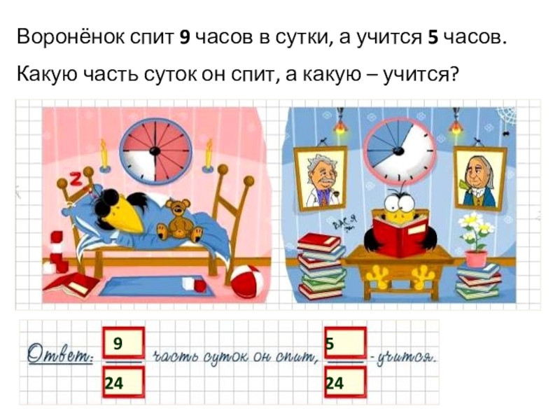 Слайд 29Воронёнок спит 9 часов в сутки, а учится 5 часов.