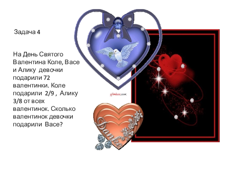 72 валентинки. Коле подарили 2/9 , Алику 3/8 от всех валентинок. Сколько валентинок девочки подарили Васе?