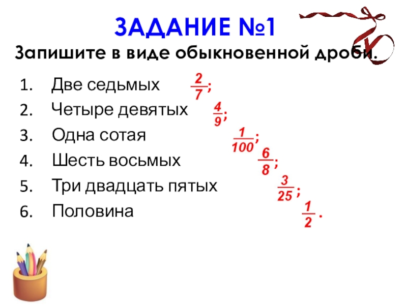 Например: - одна пятая; - две шестых.