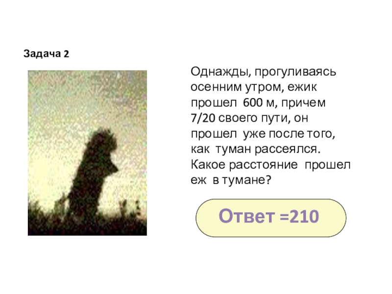 Слайд 38Однажды, прогуливаясь осенним утром, ежик прошел 600 м, причем 7/20 своего