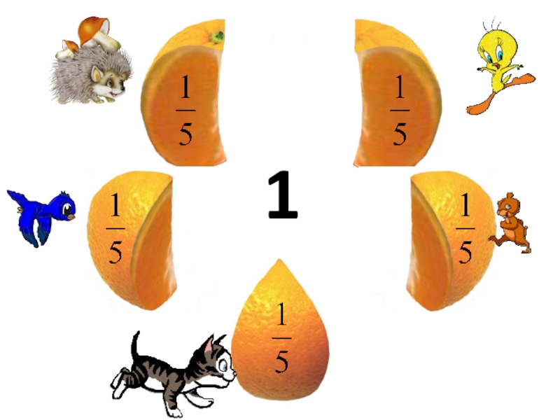 как апельсин разделили на 5 равных частей (долей), то каждый получил «одну пятую» долю апельсина, или, короче «одну пятую апельсина».