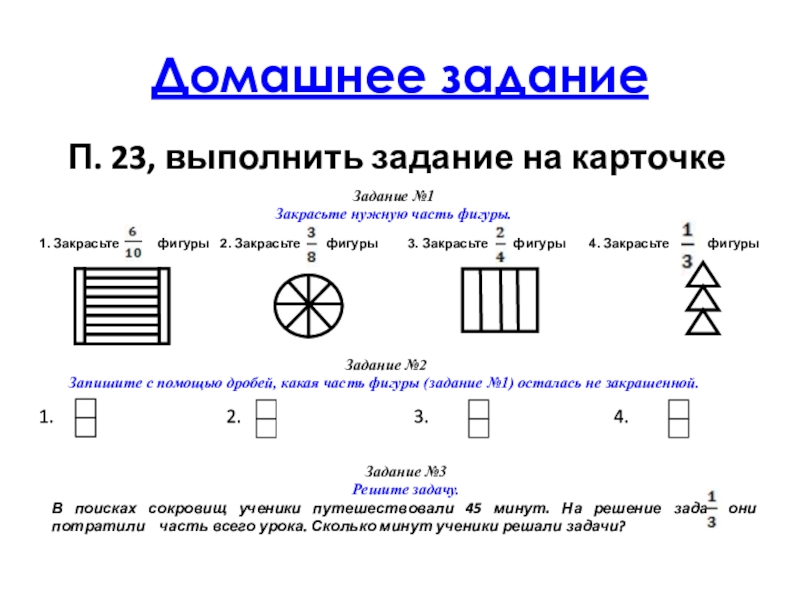 В поисках сокровищ ученики путешествовали 45 минут. На решение задач они потратили часть всего урока. Сколько минут ученики решали задачи?