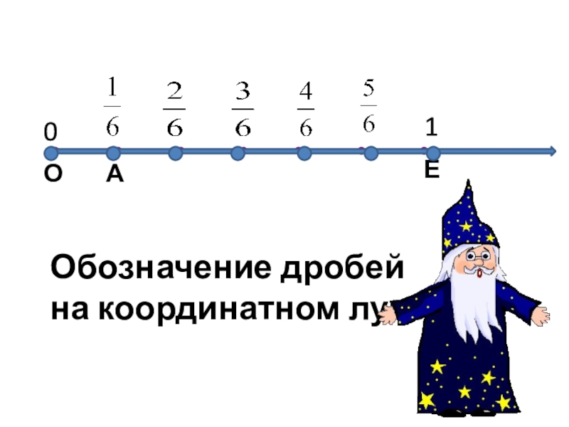 Слайд 24Обозначение дробей на координатном луче