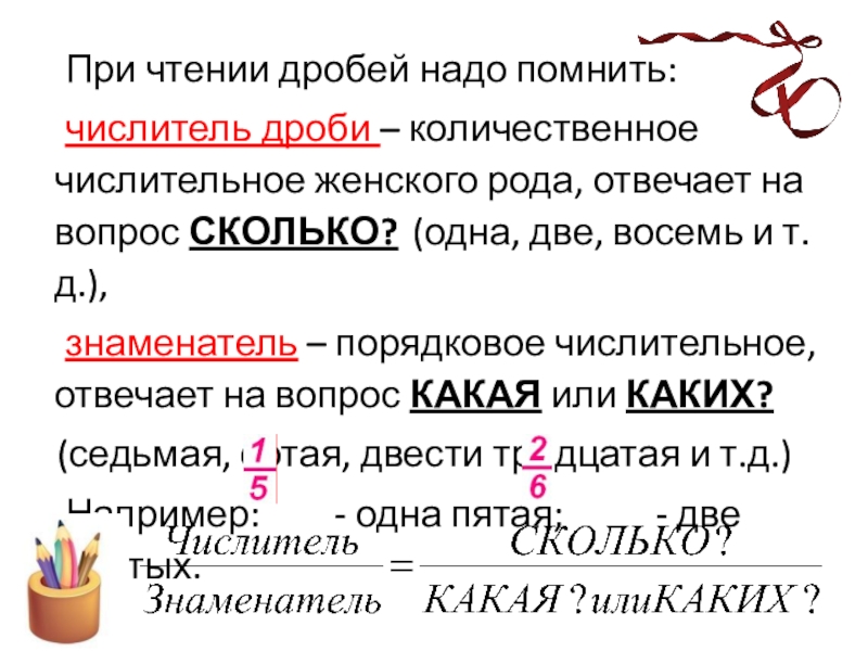 знаменатель – порядковое числительное, отвечает на вопрос КАКАЯ или КАКИХ?