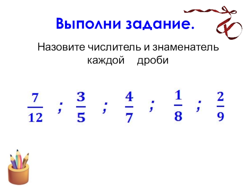 Слайд 20Назовите числитель и знаменатель каждой дроби
