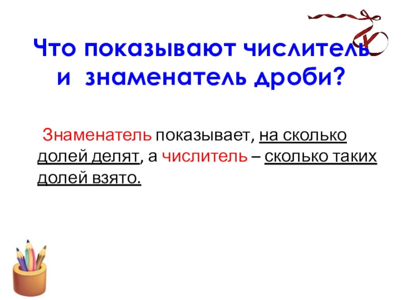 Слайд 22Что показывают числитель и знаменатель дроби?