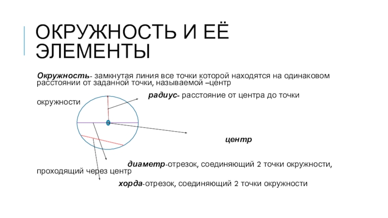 Окружность и её элементыОкружность- замкнутая линия все точки которой находятся на одинаковом расстоянии от заданной точки, называемой –центр