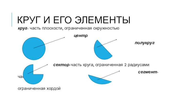 Круг и его элементыкруг- часть плоскости, ограниченная окружностью