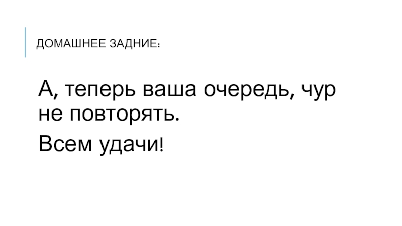 Домашнее задние:А, теперь ваша очередь, чур не повторять.Всем удачи!