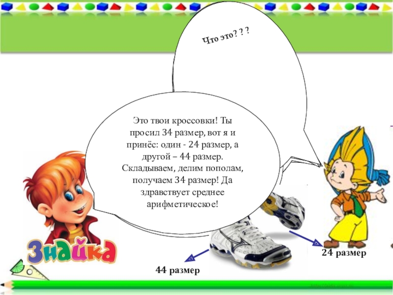 Это твои кроссовки! Ты просил 34 размер, вот я и принёс: один - 24 размер, а другой – 44 размер. Складываем, делим пополам, получаем 34 размер! Да здравствует среднее арифметическое!