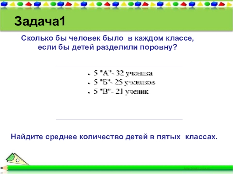 Надо было решить сегодня задачи. Ты решил 9 штук, а я одну. Складываем 9 и 1, делим на 2, получаем 5. Значит, каждый решил по 5 задач.