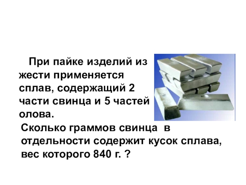 Сколько граммов свинца в отдельности содержит кусок сплава, вес которого 840 г. ?