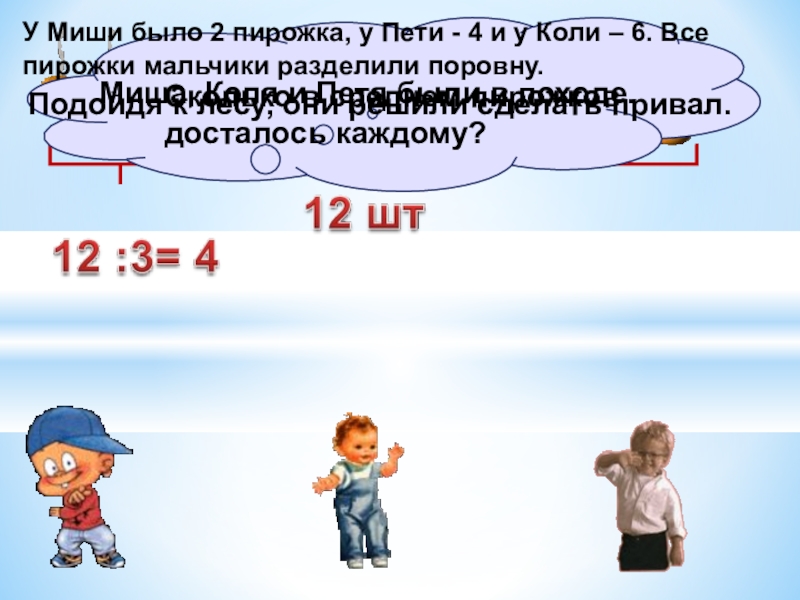 У Миши было 2 пирожка, у Пети - 4 и у Коли – 6. Все пирожки мальчики разделили поровну.