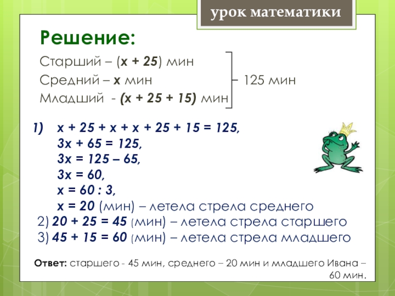 2) 20 + 25 = 45 (мин) – летела стрела старшего