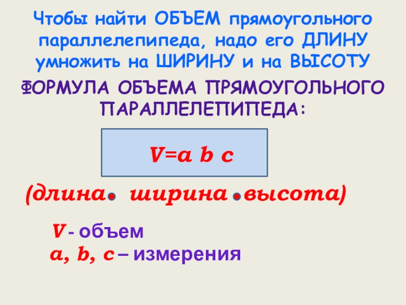 ФОРМУЛА ОБЪЕМА ПРЯМОУГОЛЬНОГО ПАРАЛЛЕЛЕПИПЕДА: