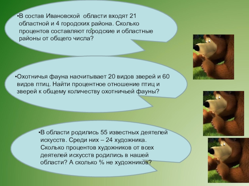 В области родились 55 известных деятелей искусств. Среди них – 24 художника. Сколько процентов художников от всех деятелей искусств родились в нашей области? А сколько % не художников?