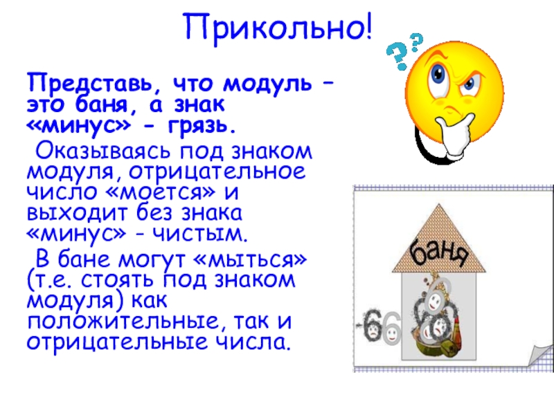 Прикольно! Представь, что модуль – это баня, а знак «минус» - грязь.  Оказываясь под знаком модуля,