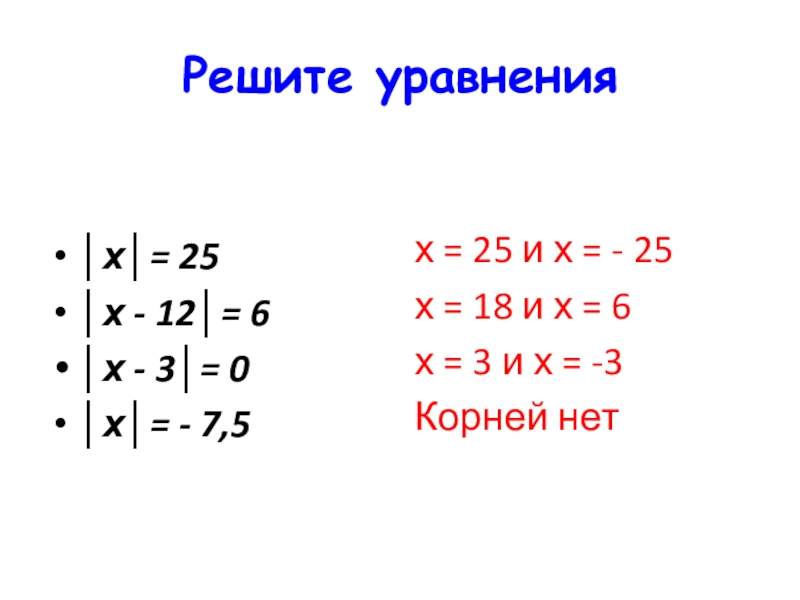 Решите уравнения│х│= 25│х - 12│= 6│х - 3│= 0│х│= - 7,5х = 25 и х = -