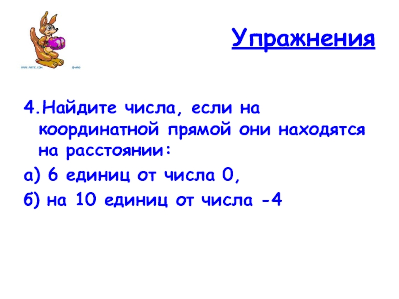 Упражнения4.Найдите числа, если на координатной прямой они находятся на расстоянии: а) 6 единиц от числа 0, б)