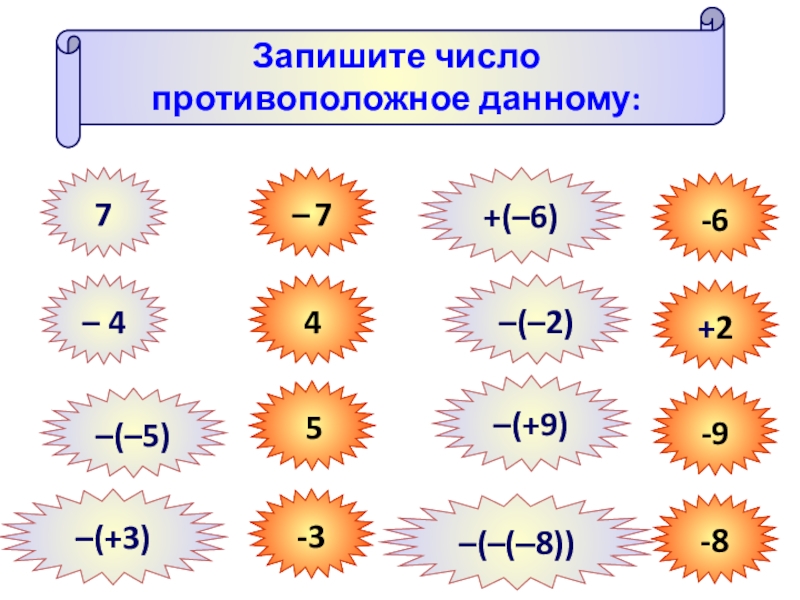 Запишите число противоположное данному:7– 7– 44–(–5) 5–(+3)-3-6+2-9-8+(–6)–(–2)–(+9)–(–(–8))