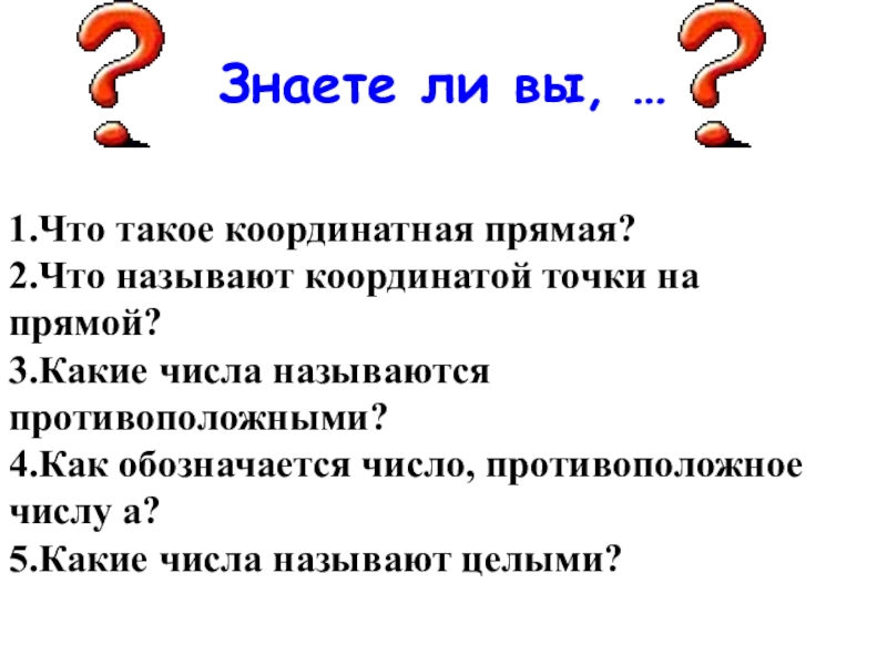 1.Что такое координатная прямая?2.Что называют координатой точки на прямой?3.Какие числа называются противоположными?4.Как обозначается число, противоположное числу а?5.Какие числа называют целыми?Знаете ли вы, …