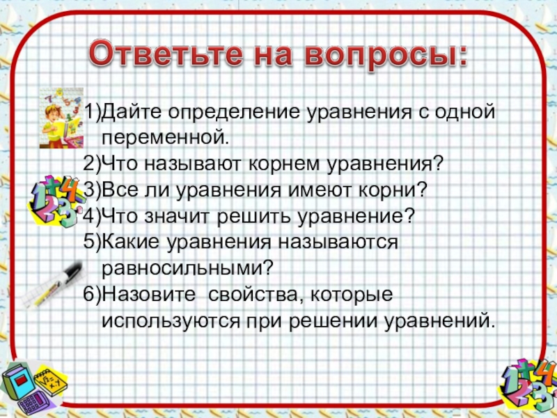 Дайте определение уравнения с одной переменной.Что называют корнем уравнения?Все ли уравнения имеют корни?Что значит решить уравнение?Какие уравнения называются равносильными?Назовите свойства, которые используются при решении уравнений.